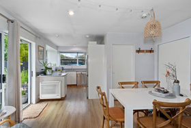 Open plan kitchen and dining area flowing out through sliding doors to patio