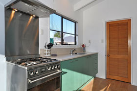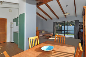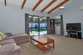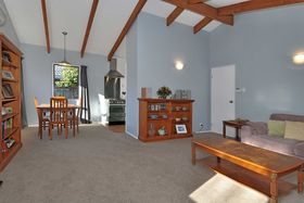 Roomy open plan living with cathedral ceilings and exposed wooden beams that create an amazing impression of space and light. North and west facing with ranchslider to sun trapped outdoor deck and garden