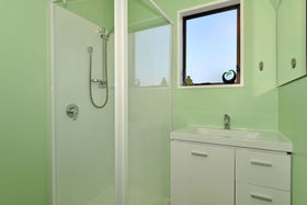 Bathroom has shower, and vanity, separate toilet and laundry.