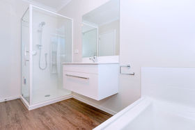 Gorgeous roomy stylish bathroom with shower, vanity and bath.
