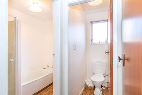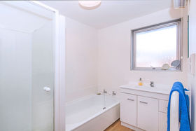 Tidy bright bathroom, shower, vanity and bath and separate toilet.