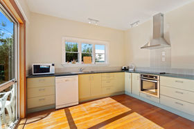 the compact yet highly-functional kitchen feature quality fixtures and fittings. Bathed in natural